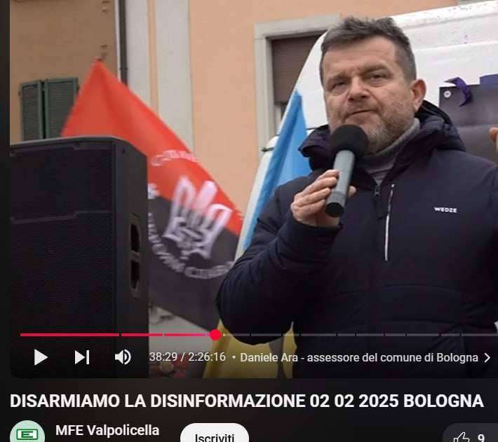 L’assessore Daniele Ara che gravita intorno al PD di Bologna ha tenuto un discorso alla manifestazione contro la propaganda russa (avete capito bene, parlano loro di propaganda che hanno 9 media su 10 pagati da USAID e che tra max 6 mesi scompariranno) con le bandiere rosso-nere dei nazionalisti ucraini.