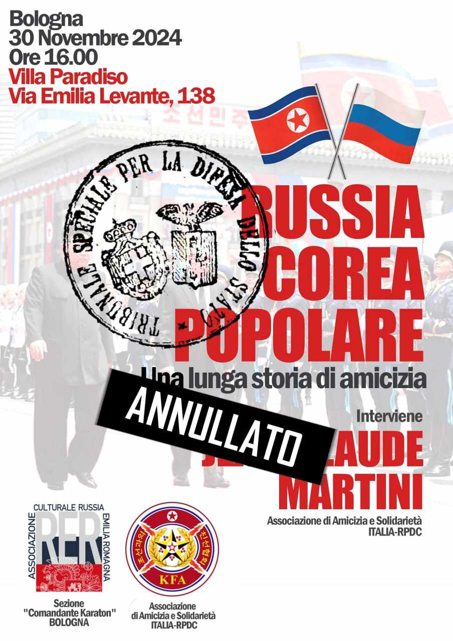 “I fondamentalisti liberali che governano la città di Bologna hanno bloccato, con una diffida ai gestori della Casa di Quartiere Villa Paradiso, l’iniziativa sull’amicizia tra la Russia e la Corea Popolare”, affermano i promotori del convegno.