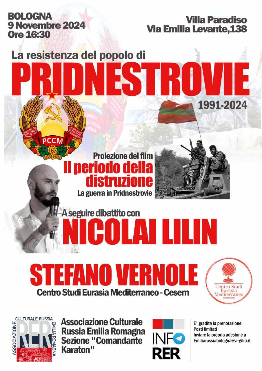 L’evento è organizzato dall’associazione culturale Russia – Emilia Romagna – Sezione Comandante Karaton e vedrà da programma la proiezione del film Il periodo della Distruzione. La guerra in Pridnestrovie e, a seguire, un dibattito con Nicolai Lilin e Stefano Vernole, vicepresidente del Centro Studi Eurasia e Mediterraneo.