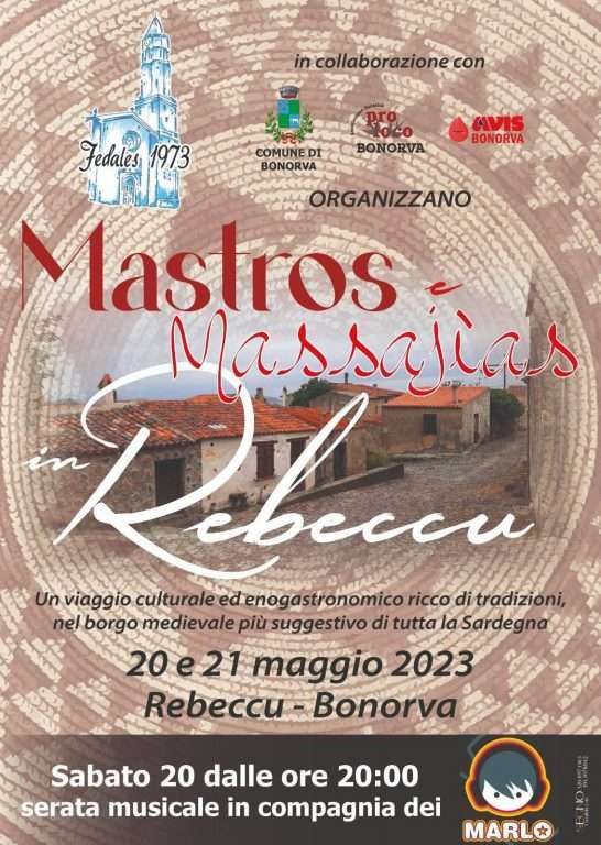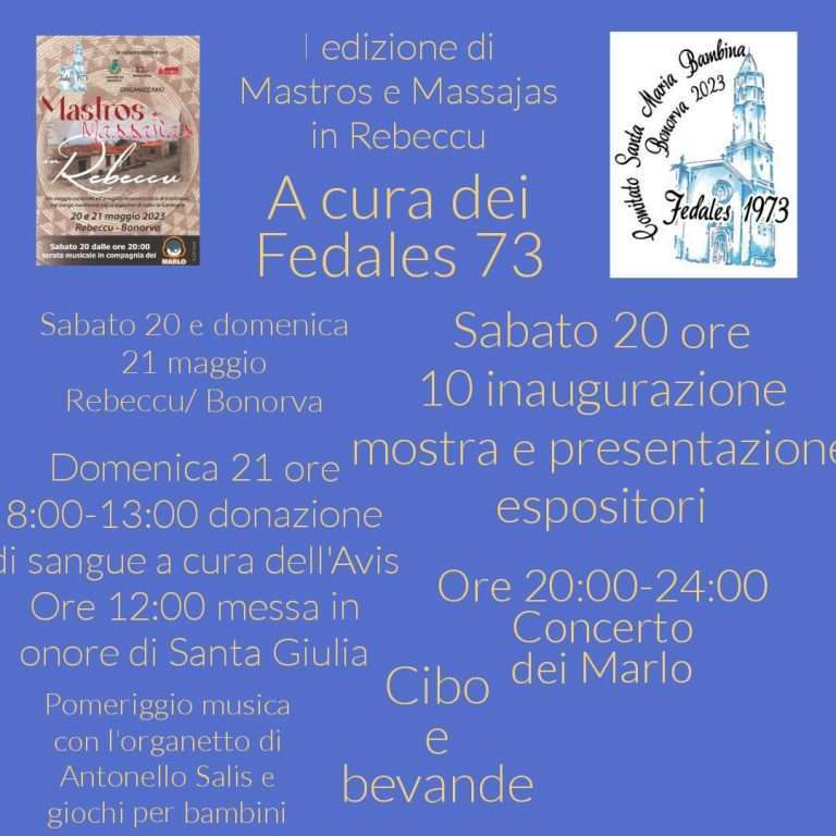 Nei giorni 20 e 21 Maggio 2023 nel Borgo Medievale di Rebeccu di Bonorva, il comitato Santa Maria Bambina 2023, organizza due giorni di mostra enogastronomica, tradizioni sarde con espositori di torrone, tappeti, maschere tradizionali, miele, salumi, formaggi, mosa, ricami e birre Artigianali.