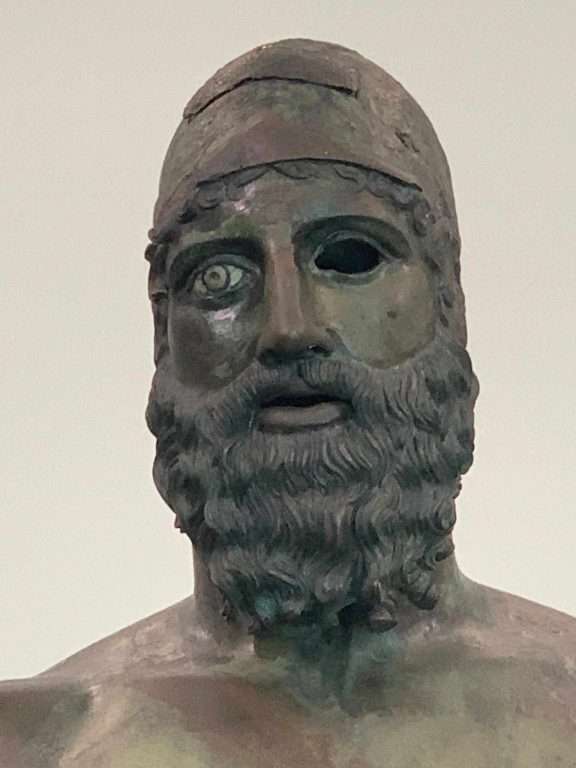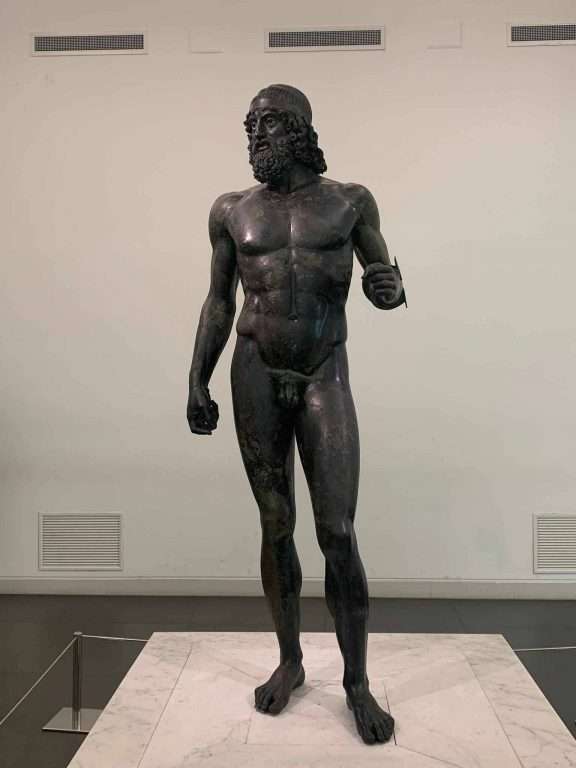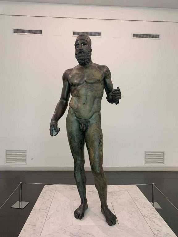 I bronzi di Riace sono stati trovati nel 1972, merito di un sub dilettante, nel 1974 in Sardegna un agricoltore di Cabras, con un trattore, impatta con un gigante a Monti Prama, due scoperte in Calabria e in Sardegna che rivoluzionano la Storia dell’Arte dell’intero Occidente, entrambe le scoperte hanno specificità stilistiche e linguistiche locali: i giganti sardi risalenti all’ottavo secolo a.C.sono il primo esempio di scultura monumentale a tutto tondo dell’intero Occidente, i bronzi di Riace risalgono al V secolo a.C. e paiono un anomalia in tutto il tracciato della storia dell’arte del periodo, unici originali e non riprodotti, paiono arte contemporanea nella loro specificità, quasi come fossero una commissione privata.