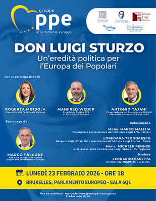 La figura di Don Luigi Sturzo, fondatore del Partito Popolare Italiano, da iscriversi a pieno titolo fra i padri fondatori del popolarismo europeo, sarà al centro della conferenza-dibattito “Don Luigi Sturzo. Un’eredità politica per l’Europa dei Popolari”, in programma a Bruxelles lunedì 23 febbraio 2026, alle ore 18, al Parlamento Europeo.