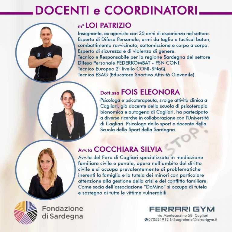 Il corso ideato dal m° Patrizio Loi è studiato per offrire delle basi teorico-pratiche di Difesa Personale, una visione analitica delle problematiche inerenti la violenza domestica e di genere, delle nozioni e consigli legali. Il grado di preparazione, le competenze specifiche e l’esperienza dei docenti, assieme alla struttura del progetto, rende unico nel suo genere il corso proposto.