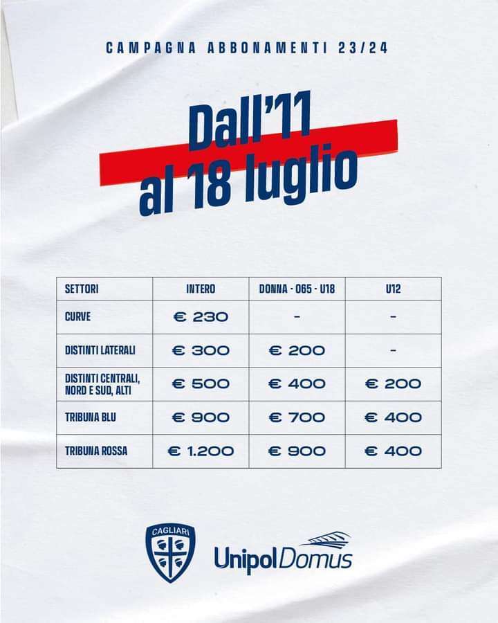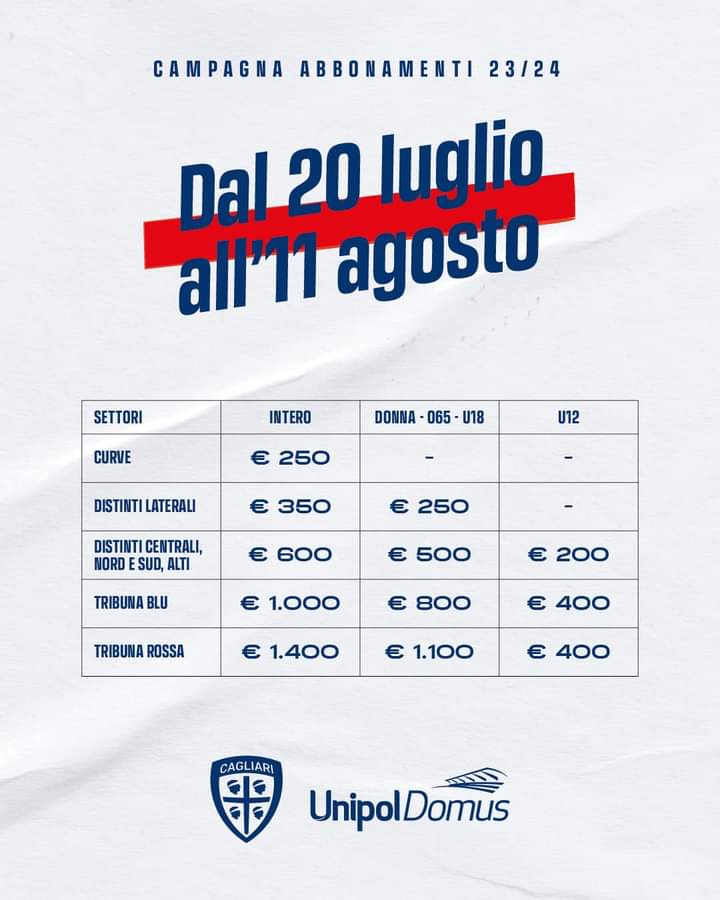 Il Cagliari Calcio comunica la partenza della campagna abbonamenti 2023/2024.
