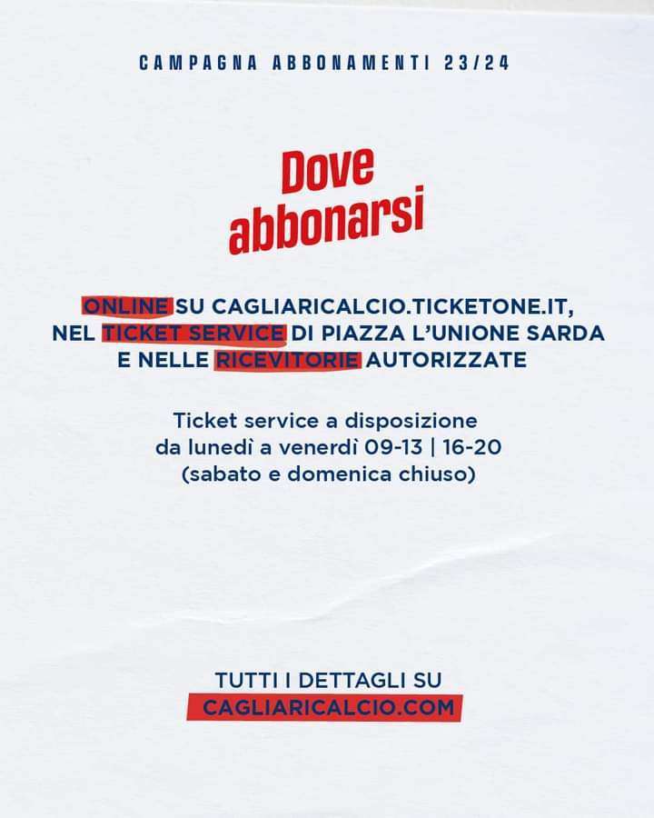 La società ricorda inoltre che sia possibile rinnovare la propria “Passione Casteddu”: chi avesse una fidelity card già scaduta o in scadenza – la data è indicata sul retro – potrà effettuare il rinnovo direttamente online sul sito del Cagliari Calcio oppure presso il Ticket Service di Piazza L’Unione Sarda.