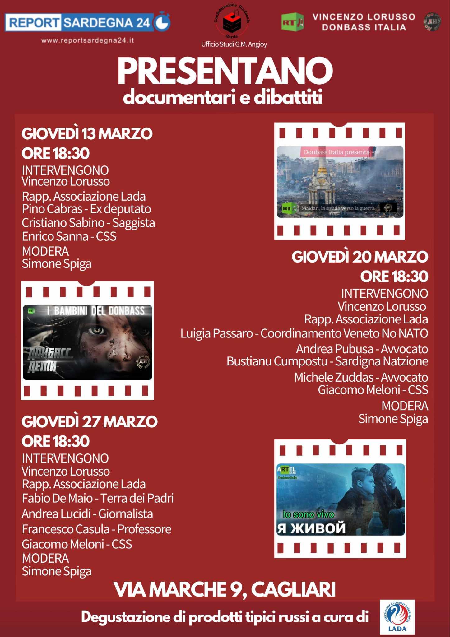 Dopo le “intimidazioni” della Questura, che ha portato alla censura dei documentari che sarebbero dovuti essere proiettati nel mese di febbraio a Cagliari, ReportSardegna 24 insieme al Centro Studi Giovanni Maria Angioy e alla Confederazione Sindacale Sarda hanno promosso la programmazione di una nuova serie di proiezioni sul tema del conflitto che dal 2014 coinvolge i territori del Donbass.