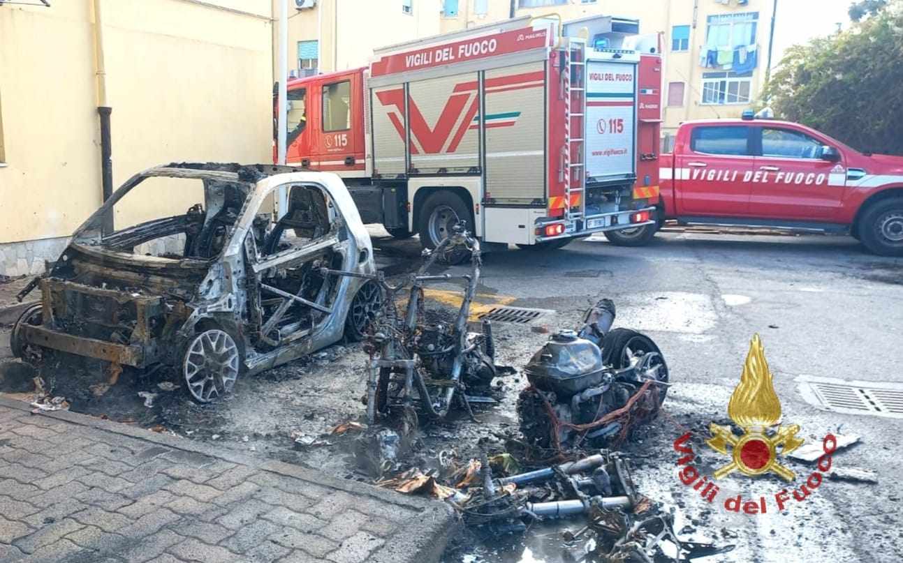 Intervento in serata dei Vigili del fuoco in via Ardenne a Cagliari, per spegnere le fiamme che hanno coinvolto un’autovettura e due scooter in sosta.