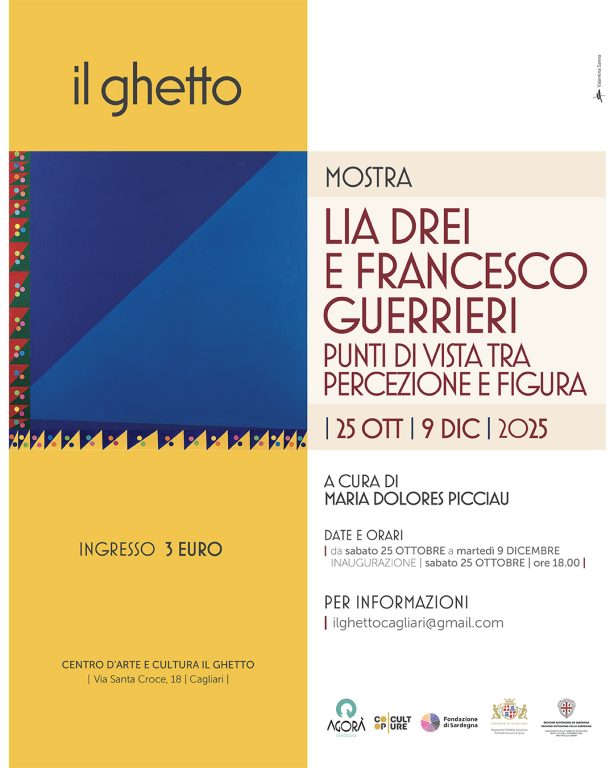 Fino al 9 dicembre 2025, il Centro comunale d’Arte e Cultura “Il Ghetto” di via Santa Croce n. 18 a Cagliari, ospita la mostra “Lia Drei e Francesco Guerrieri: punti di vista tra percezione e figura”, a cura di Maria Dolores Picciau, organizzata da Agorà Sardegna e Coopculture, in collaborazione con il Comune di Cagliari e con il contributo della Fondazione di Sardegna. L’esposizione rimarrà aperta fino al 9 dicembre, dal martedì alla domenica dalle 10 alle 13 e dalle 16 alle 19.