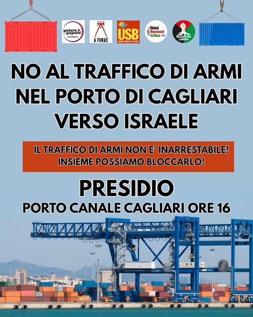 Con un appello lanciato a tutti i cittadini di Cagliari, il Comitato sardo di solidarietà con la Palestina lancia una mobilitazione per la giornata di oggi, 25 marzo contro il passaggio al Porto del Capoluogo di una nave container con materiale bellico.