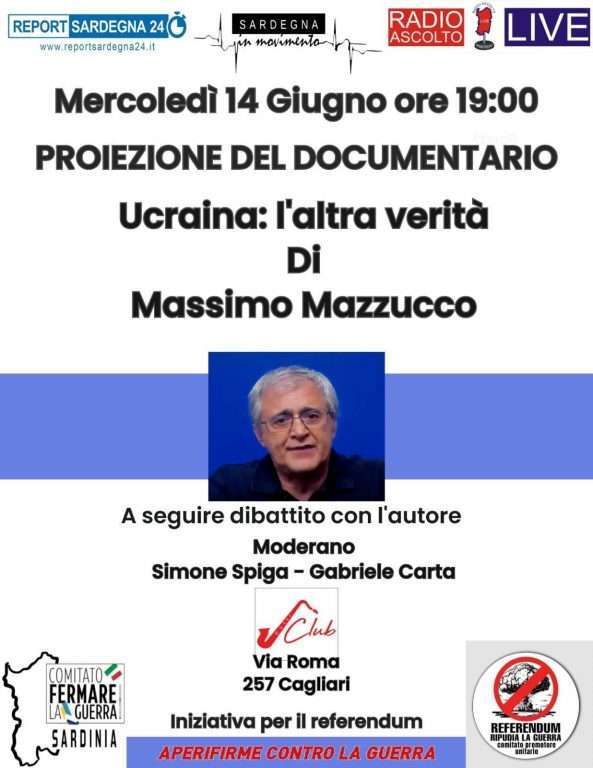 L’evento, ad ingresso libero, inizierà con la proiezione del docu – film del regista Massimo Mazzucco “Ucraina: l’altra verità”. A seguire dibattito pubblico: collegamento via video con l’autore del film insieme a Simone Spiga,  Direttore di ReportSardegna24  e Gabriele Carta di Radio Ascolto Live.