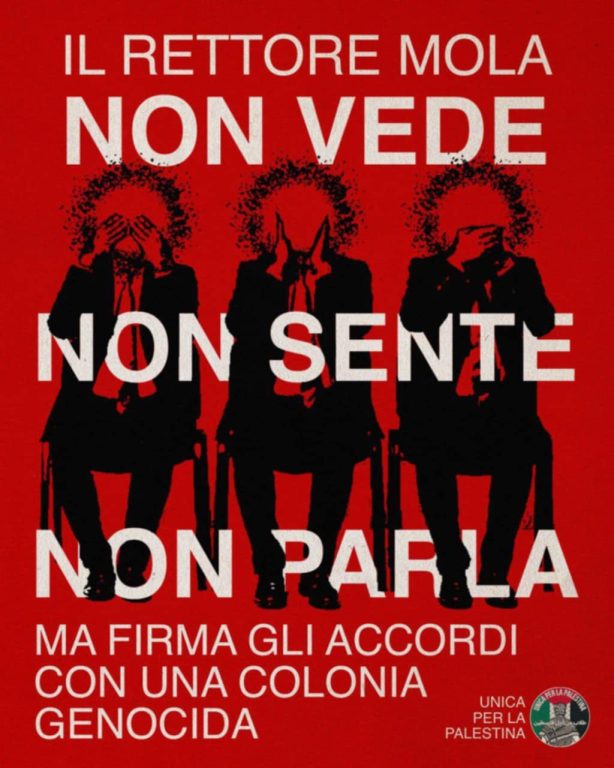 Parola d’ordine del senato: ignorare, ignorare, ignorare. Ma ormai non è più solo ignoranza, ma un utilizzo di cavilli e scappatoie burocratiche pur di continuare a collaborare con istituzioni genocidiarie per via dei vantaggi economici che ne derivano. È il funzionamento di un’università-azienda, che approva ogni cosa possa giovare al profitto anche a discapito del proprio codice etico. L’amministrazione dell’università sa benissimo quello che sta succedendo a Gaza e sa benissimo quello che succede nelle stanze in cui si decide di continuare a sovvenzionare Israele, e sceglie consciamente di continuare a farlo. Ma verrà il momento in cui il Rettore Mola e tutta la sua entourage di burocrati, così come prima la Del Zompo, verranno chiamati in causa per il loro appoggio al genocidio che viene perpetrato con la massima brutalità dal cancro sionista in Palestina. È ora di mobilitarci ancora più intensamente e in numeri ancora più grandi, per fare in modo che questi accordi non possano continuare tramite sotterfugi e bugie. È il nostro dovere nei confronti di un popolo oppresso con l’aiuto esplicito delle nostre istituzioni”, affermano i giovani attivisti.