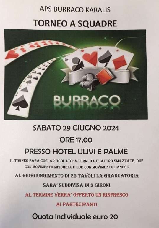 Giocando a carte ci si conosce e nascono nuove amicizie, questo lo spirito dell’Aps burraco Karalis che ha promosso un torneo di burraco, sabato 29 giugno dalle ore 17 presso l’Hotel Ulivi e Palme a Cagliari.