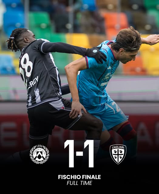 Finisce in parità al Bluenergy Stadium: 1-1 tra Udinese e Cagliari, al termine di una gara combattuta, intensa e ricca di episodi. Il Cagliari di Fabio Pisacane passa in vantaggio con il primo gol in Serie A di Gennaro Borrelli, ma nella ripresa Kabasele timbra la rete del pareggio. Nel finale, i friulani sfiorano più volte la vittoria, ma un super Caprile e gli errori di Zaniolo e Bayo tengono in piedi i rossoblù, che vanno alla nuova sosta con un punto prezioso.