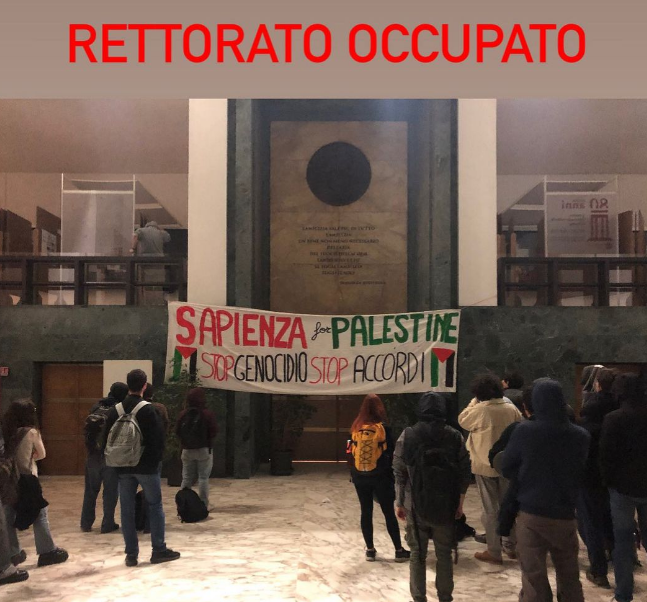 “Nel giorno precedente il Senato accademico della Sapienza, gli studenti occupano il rettorato: basta complicità con Israele, fuori la rettrice da Med-Or, no alla partecipazione al bando del ministero degli Esteri, basta accordi con università israeliane e filiera bellica”.