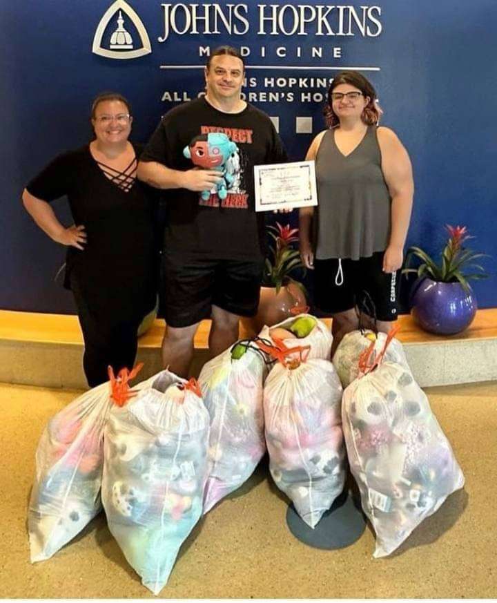 “La scorsa settimana abbiamo portato sette sacchi pieni di peluche al Johns Hopkins All Children’s Hospital di St. Petersburg, in Florida. Grazie mille a tutto il personale! Ci hanno anche dato un certificato per la donazione ma onestamente credo che meritino molto di più per tutto quello che fanno per aiutare i bambini”.