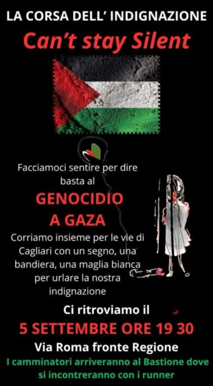 Il 5 settembre a Cagliari alle 19.30 partirà da Via Roma (fronte Palazzo Regionale)la corsa dell’indignazione. Camminatori e runner attraverseranno le vie del centro storico per urlare il loro dissenso per le atrocità che continuano a colpire il popolo palestinese a Gaza e in Cisgiordania.