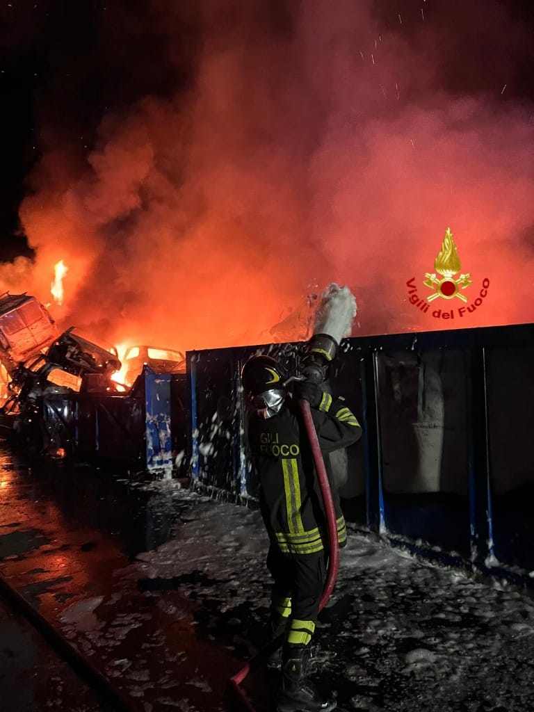 Fiamme altissime e fumo denso visibili a chilometri di distanza hanno interessato alcune carcasse di auto stoccate in attesa di essere demolite.