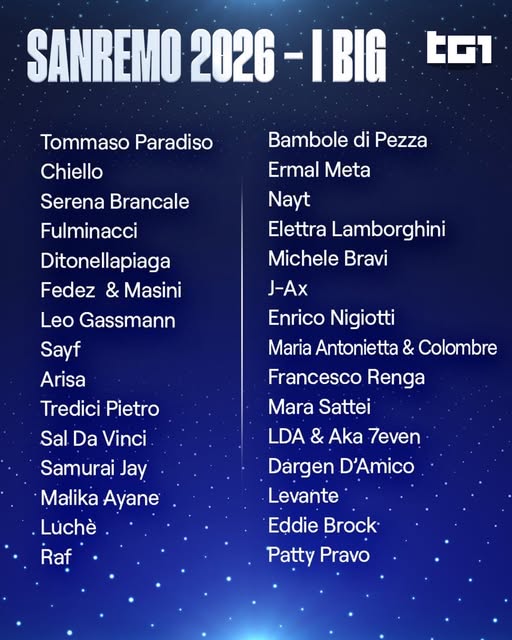Tommaso Paradiso, Chiello, Serena Brancale, Fulminacci, Ditonellapiaga, Fedez e Masini, Leo Gassmann, Sayf, Arisa, Tredici Pietro, Sal Da Vinci, Samural Jay, Malika Ayane, Luchè sono tra i 30 Big in gara al Festival di Sanremo 2026 (24-28 febbraio).