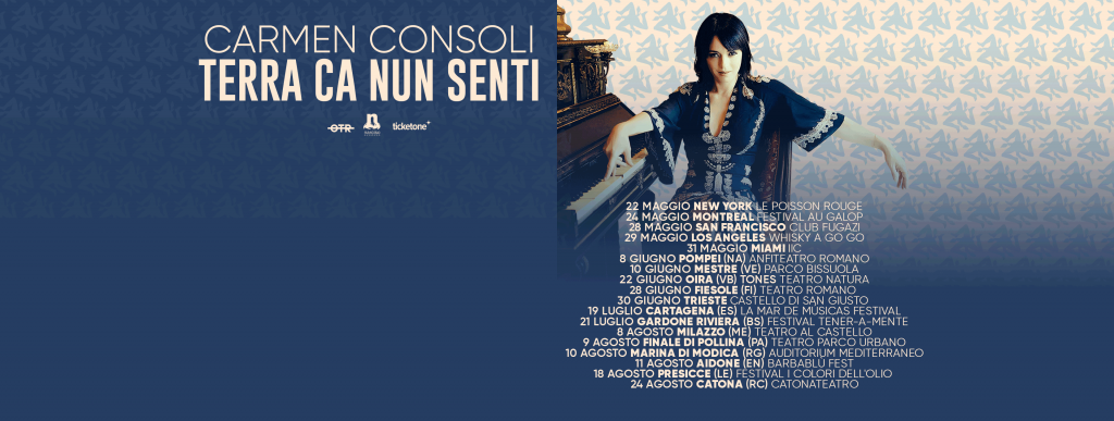 Ecco le date del tour mondiale di Terra ca nun senti. Dopo il prologo in Usa e Canada, il tour di Carmen & band prosegue in Spagna e Italia. Tra le date del tour, quello dell’8 giugno all’Anfiteatro Romano di Pompei (NA) resterà un evento unico.