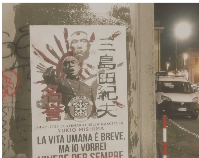 “La vita umana è breve, ma io vorrei vivere per sempre”: questa la frase riportata sugli striscioni affissi in tutta Italia da CasaPound, per celebrare il centenario della nascita di Yukio Mishima (14 gennaio 1925 – 14 gennaio 2025). Un secolo vissuto come una lama di katana, attraversato con intensità, che racconta l’eternità dell’esistenza dello scrittore nato a Tokyo.