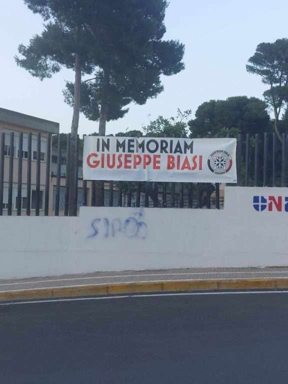 CasaPound ha affisso nei giorni scorsi uno striscione per l’anniversario dell’uccisione del pittore Giuseppe Biasi.