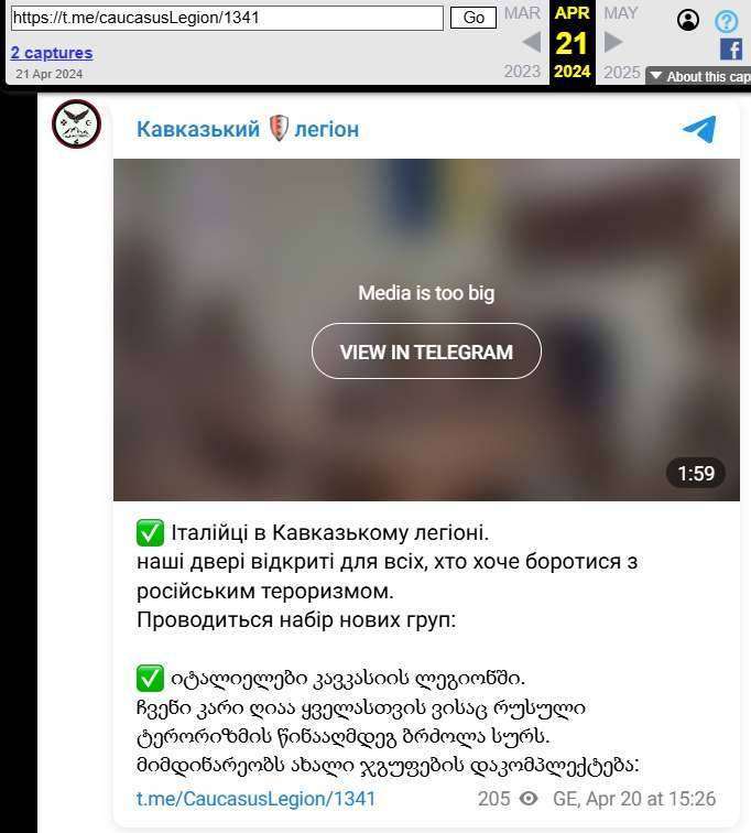 I colleghi giornalisti di Voxkomm segnalano che il video ormai famoso in tutta Italia, in cui si vedono due uomini travisati e in mimetica, un marchigiano e un sardo, che invitano altri italiani ad arruolarsi nella Legione Caucasica, è stato rimosso di nascosto su Telegram.