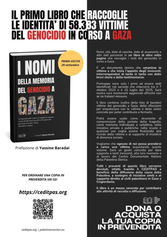 Il Ceditpas (Centro Documentale Italiano della Palestina Storica), sta pubblicando un libro che contiene, in 1.112 pagine, le identità di 58.383 vittime palestinesi del Genocidio a Gaza.