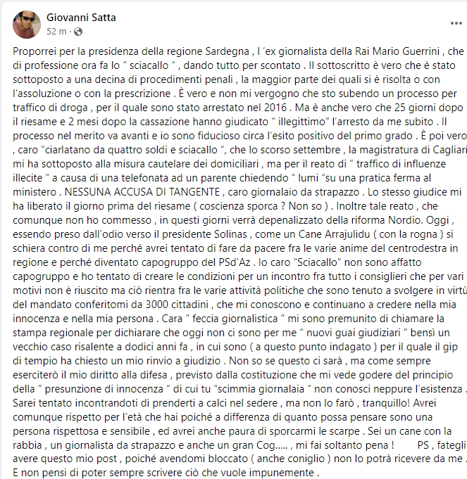 Nulla di nuovo, fatti vecchi e conosciuti ma che vanno sommati ad altre vicende giudiziarie che riguardano Satta, infatti il Consigliere Regionale è ancora sotto processo per un presunto traffico di droga, ma anche sotto processo presso la Procura di Cagliari in merito alla vendita di una Rsa di Monastir.