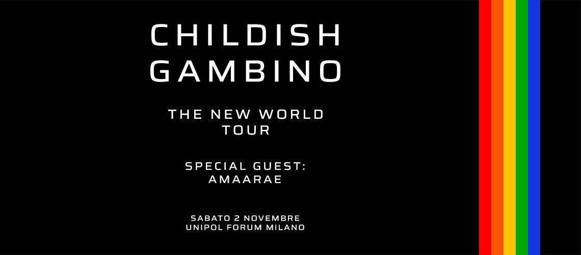 Childish Gambino torna di nuovo sulle scene globali con The New World Tour, prodotto da AEG Presents. Nel tour sarà presente anche un’unica attesissima data Italiana che si terrà il 2 Novembre all’Unipol Forum di Assago.
