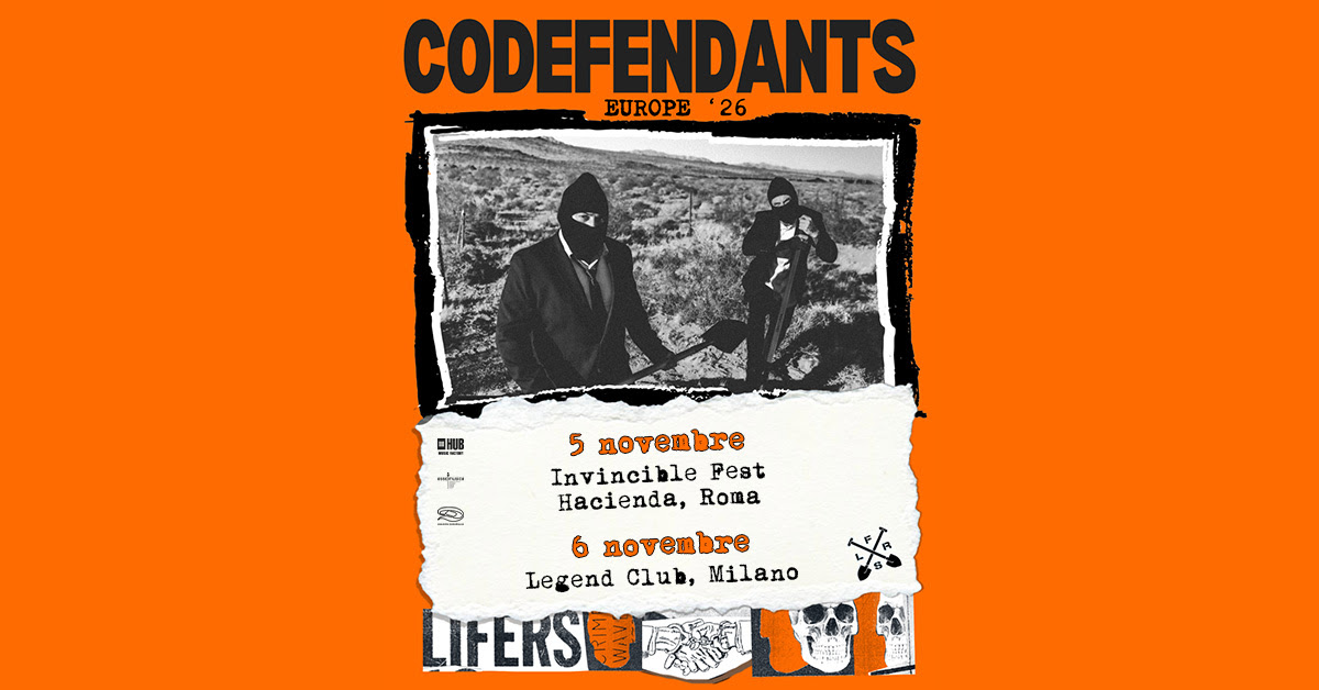 I Codefendants tornano in Italia per due attesissime date a novembre 2026. Dopo aver conquistato il pubblico del Bay Fest 2025, il gruppo punk guidato da Ceschi Ramos e Sam King è pronto a riportare nel nostro Paese il suo inconfondibile mix di punk, hip hop e rock: il 5 novembre all’Hacienda a Roma e il 6 novembre al Legend Club a Milano.