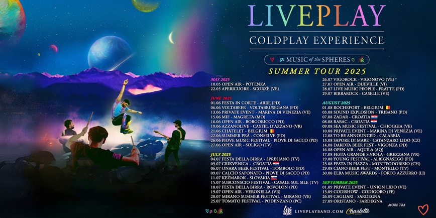 Organizzato da Sardegna Concerti e l’Associazione Insieme per Riola, il 26 settembre al Teatro Massimo di Cagliari (ore 21.30) e il 27 settembre, al Parco dei Suoni di Riola Sardo (ore 21), arriva per la prima volta in Sardegna il tour “LivePlay-Coldplay Esperience”, tra le migliore tribute band dei Coldplay.