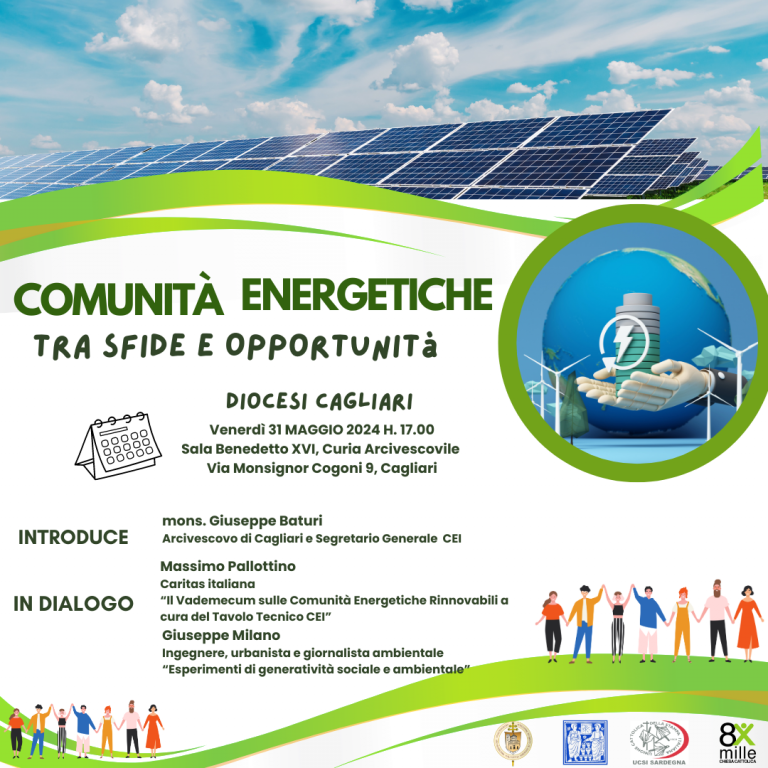 Venerdì 31 maggio a partire dalle 17, presso la Sala Benedetto XVI della Curia arcivescovile di Cagliari (via monsignor Cogoni 9), è previsto il convegno sul tema “Comunità energetiche: tra sfide e opportunità”, promosso dall’Ufficio diocesano di Pastorale sociale e del lavoro in collaborazione con Ucsi Sardegna.