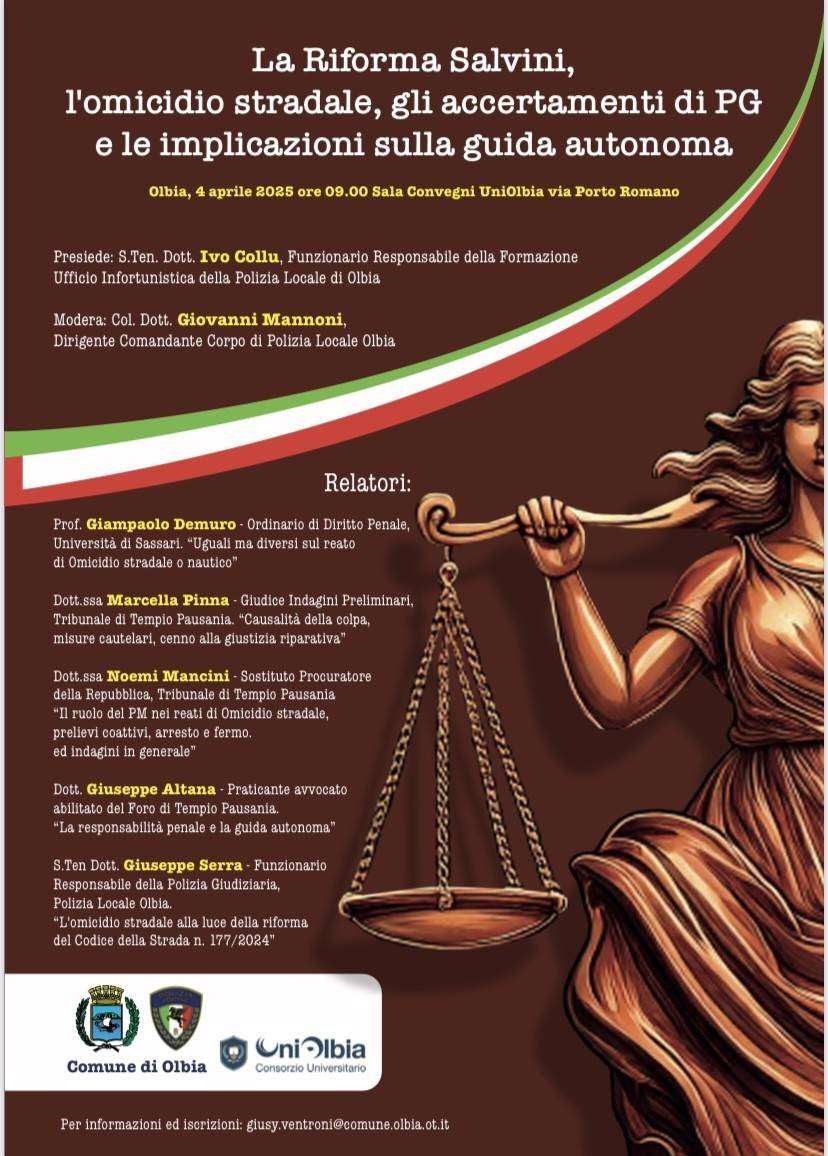 Venerdì 4 aprile 2025 alle ore 9.00 si terrà presso l’UniOlbia il convegno “La riforma Salvini, l’omicidio stradale, gli accertamenti di PG e le implicazioni sulla guida autonoma. La partecipazione, per gli iscritti all’albo degli avvocati, da diritto a tre crediti per la formazione.