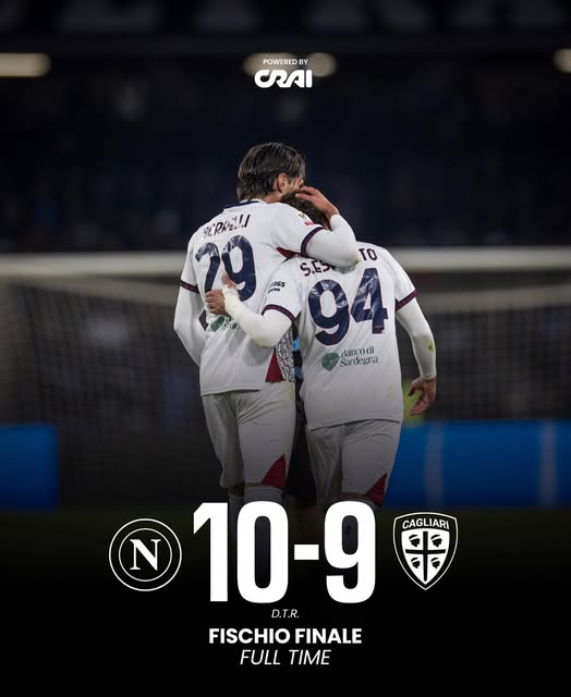 Al “Diego Armando Maradona” di Napoli il Cagliari cede solo ai rigori ai campioni d’Italia, dopo l’1-1 nei tempi regolamentari firmato da Lucca ed Esposito con un gol per tempo. Ai rigori calciano quasi tutti, finisce 10-9