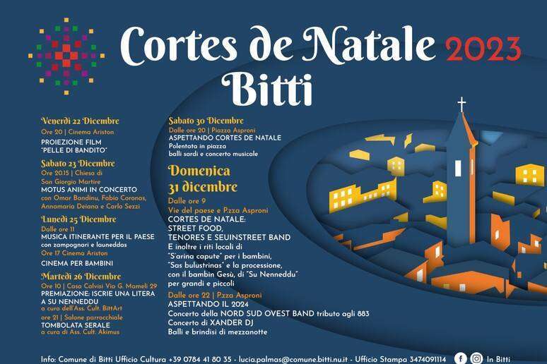 E poi il cibo locale nelle cortes e lo street food in piazza dove i fuochi, accesi dal mattino, riscalderanno l’atmosfera fino al brindisi della mezzanotte accompagnato dall’esibizione dal vivo dei “Nord sud ovest band, tributo agli 883” e poi dalle performance di “Xander Dj”.