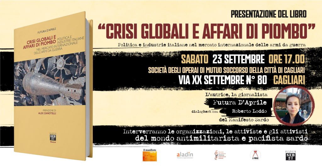 Sabato 23 settembre alle ore 17.00 nella sala conferenze della Società degli Operai di Mutuo Soccorso della Città di Cagliari in Via XX Settembre 80, il manifesto sardo con la collaborazione di Aladin Pensiero e della Scuola di Cultura Politica Francesco Cocco organizza la presentazione del libro edito da SEB27 Crisi globali e affari di piombo. Politica e industrie italiane nel mercato internazionale delle armi da guerra. L’autrice, la giornalista Futura D’Aprile dialogherà con Roberto Loddo del manifesto sardo.