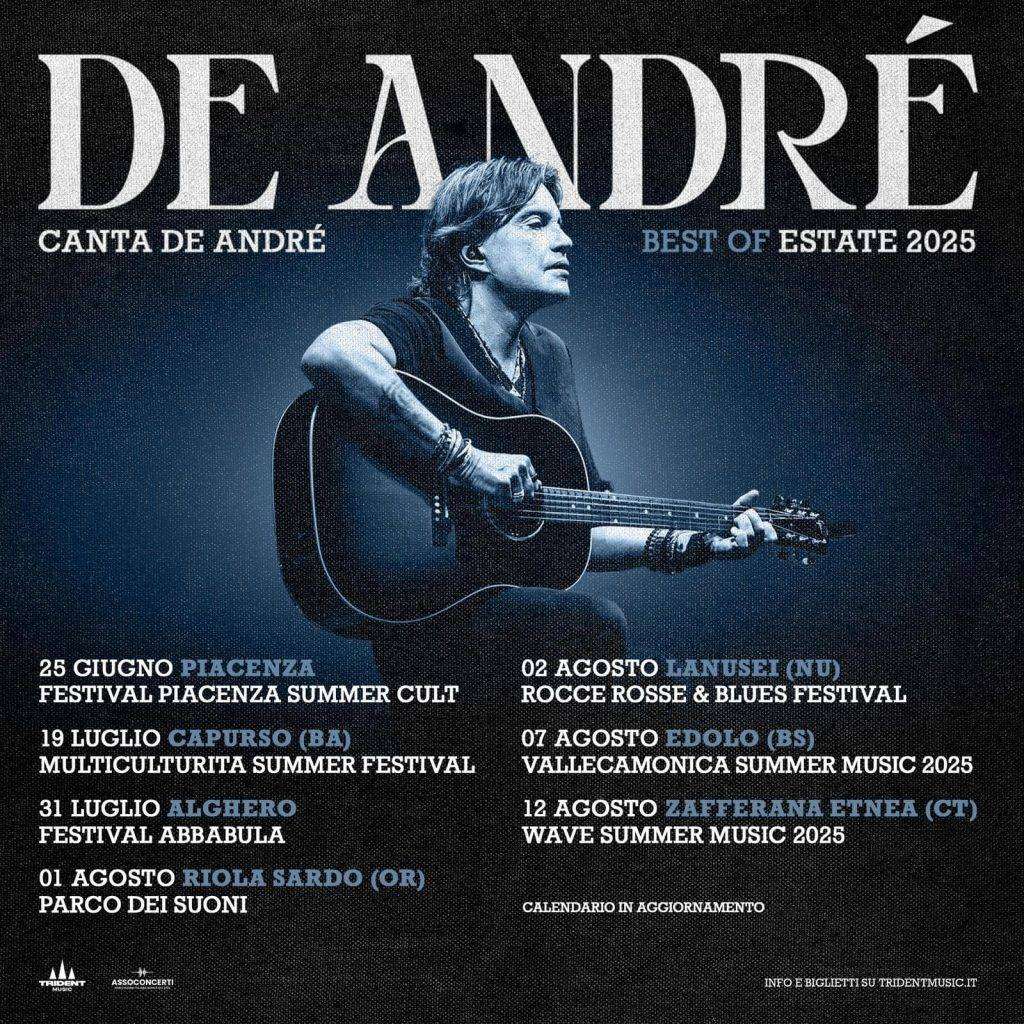 Nel 2025 Cristiano De André si esibirà in concerto in tutta Italia con ‘De André canta De André tour estivo’, un omaggio al padre Fabrizio e alle sue canzoni impresse nella memoria collettiva e ancora estremamente attuali.