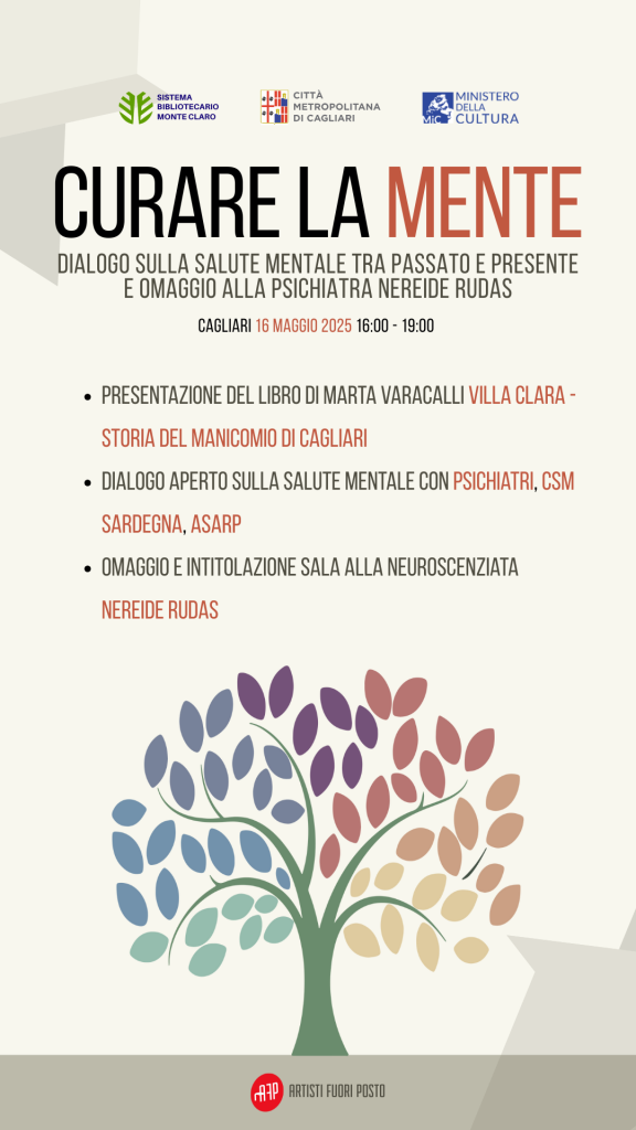 Organizzato con la collaborazione dell’Associazione Artisti Fuori Posto, l’evento prevede la presentazione del libro “Villa Clara – Storia del Manicomio di Cagliari” di Marta Varacalli con letture interpretative organizzate dalla Compagnia teatrale; seguirà un dibattito sul tema “La cura psichiatrica in Sardegna nel 2025”, con le relazioni di psichiatri in attività nei CSM: la dott.ssa Maria Giada Tronci (attualmente Dirigente Medico Psichiatra presso il Centro di Salute Mentale Cagliari 2 – Quartu Sant’Elena, ASL Cagliari e Consulente presso l’Istituto Penitenziario Minorile di Quartucciu per i giovani adulti), la Dott.ssa Gesuina Intilla (attualmente Direttore f.f. del Servizio SC CSM Asl Sulcis Iglesiente) e la vice presidente Rita Melis dell’Associazione Sarda per l’Attuazione della Riforma Psichiatrica (Asarp).