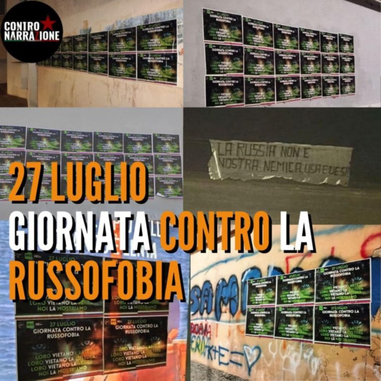 In occasione delle prima Giornata contro la Russofobia, un centinaio di manifesti e uno striscione sono stati esposti a Genova in protesta alle politiche censorie e belliciste portate avanti dall’asse euro-atlantico e dai suoi agenti italiani.