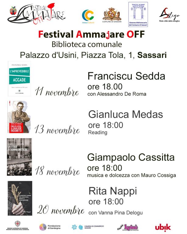 Il Festival Ammajare OFF è promosso dall’associazione Intrecci Culturali, con il patrocinio del Comune di Sassari, della Regione Autonoma della Sardegna, del Sistema Bibliotecario Comunale, ed è reso possibile grazie alla preziosa collaborazione della Fondazione di Sardegna, della Camera di Commercio di Sassari, della Rete delle Streghe – Città di Siligo e della Libreria Internazionale Koinè.