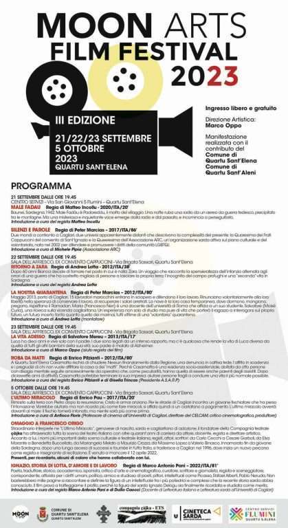Dal 21 settembre al 5 ottobre a Quartu Sant’Elena si terrà la terza edizione del Moon Arts Film Festival, rassegna cinematografica internazionale “tematica” con la direzione artistica del filmmaker e produttore Marco Oppo.