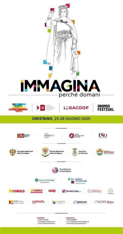 Presentata a Oristano “IMMAGINA – Perché domani”, quarta edizione del Festival dello Sviluppo Sostenibile promossa da Legacoop Sardegna e Dromos, in programma nella città di Eleonora da mercoledì 25 a sabato 28 giugno. Sono intervenuti alla conferenza stampa l’assessore alla Cultura del Comune di Oristano Luigi Mureddu, il direttore dell’Università di Oristano Francesco Asquer, il vicepresidente nazionale e presidente regionale di LegaCoop Claudio Atzori, il presidente di Dromos Salvatore Corona e Gabriele Chessa, presidente di Legacoop Oristano, nella cui sede si è tenuto l’incontro. Qui di seguito le loro dichiarazioni.