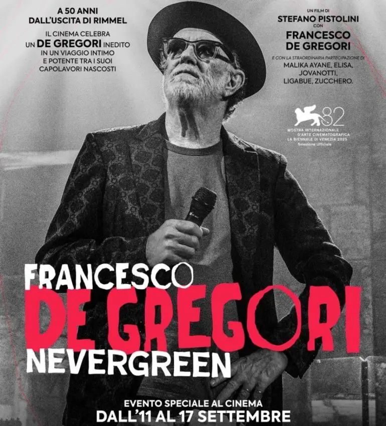 Il docufilm “Francesco De Gregori. NEVERGREEN” di Stefano Pistolini, prodotto da OUR FILMS, società del gruppo Mediawan, Friends TV, Darallouche e Caravan, verrà presentato in anteprima alla 82. Mostra Internazionale d’Arte Cinematografica di Venezia nella sezione Fuori Concorso – Speciale Cinema & Musica. Il film arriverà poi al cinema come evento speciale per Nexo Studios dall’11 al 17 settembre. Le prevendite e l’elenco delle sale saranno disponibili da venerdì 8 agosto sul sito nexostudios.it.
