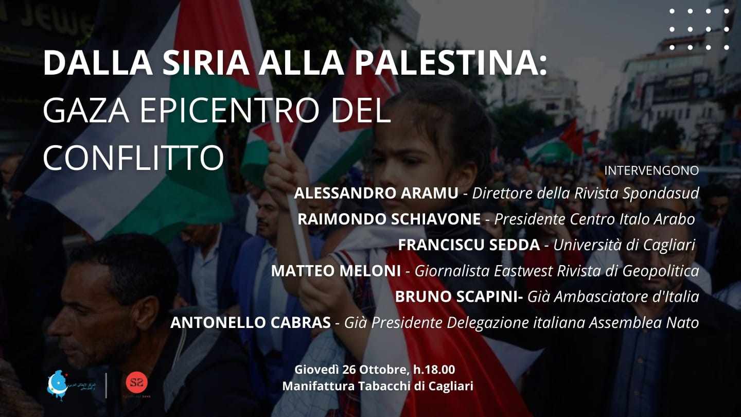 Se ne parlerà giovedì 26 ottobre, alle ore 18, negli spazi della Manifattura Tabacchi di Cagliari, nel corso di un evento pubblico promosso dal Centro Italo Arabo e del Mediterraneo con Spondasud Rivista di Politica Internazionale dal titolo: “Dalla Siria alla Palestina: Gaza epicentro del conflitto”.