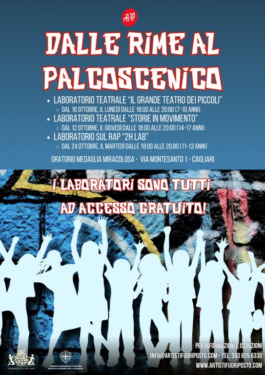 Il teatro, la rima e il corpo sono tre potentissime arti dell’espressione, sono le strade che i giovani percorrono per imparare a dire al mondo chi sono e chi vogliono diventare, trasformando parole in potenti strumenti di creatività e cambiamento. Il progetto “Dalle rime al palcoscenico” darà loro questa possibilità e, a partire dal mese di ottobre fino a dicembre, la compagnia Artisti Fuori Posto, con il contributo del Comune di Cagliari (manifestazioni culturali e di spettacolo anno 2023) e della Regione Autonoma della Sardegna, e in collaborazione con l’Oratorio Medaglia Miracolosa di Cagliari, che ospiterà l’iniziativa,  attiverà tre importanti laboratori creativi gratuiti con tre artisti e formatori di grande rilievo nel panorama isolano e nazionale.