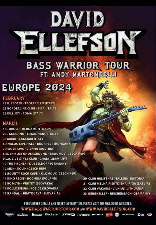 A completare la line up che salirà sul palco con David Ellefson ci saranno i chitarrista Andrea Martongelli (Basstory, Ellefson-Soto e Altitudes & Attitude) e Walter Cianciusi (Geof Tate’s Operation Mindcrime), Roberto Pirami (Michael Angelo Batio, Rowan Robertson, Gus G) alla batteria e Titta Tani (Ehfar, ex batterista dei Goblin di Claudio Simonetti) alla voce.