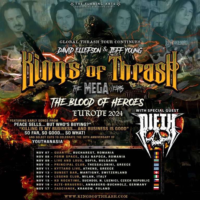 Questo tour straordinario vedrà il bassista e membro fondatore, David Ellefson, in un doppio ruolo, suonando il basso per entrambe le band. I Kings of Thrash proporranno una scaletta travolgente con i classici da “Peace Sells…But Who’s Buying?”, “Killing Is My Business…And Business Is Good!”, “So Far, So Good, So What?” e alcuni pezzi scelti per celebrare il 30º anniversario di Youthanasia. I DIETH, dal canto loro, suoneranno integralmente il loro album di debutto, “To Hell and Back”.