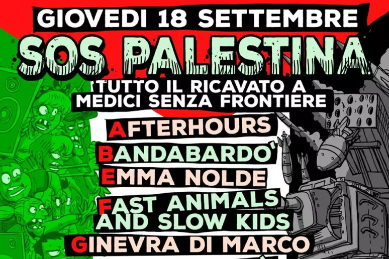 A questi nomi, si spiega in una nota, se ne aggiungeranno altri nel corso delle prossime settimane. “In Palestina è in atto un vero e proprio massacro/genocidio di popolazione civile che ha una lunghissima e controversa storia alle spalle – sottolinea Pelù -. Ancora oggi, in questo preciso momento il governo israeliano sionista di Netanyahu prosegue il suo impunito e megalomane massacro di bambini, donne, uomini, medici, giornalisti, operatori umanitari. La Palestina va aiutata con la massima urgenza e dalla mia rabbia e frustrazione per quello che vedo attraverso alcune pagine di informazione indipendente è scaturita l’idea di S.o.s. Palestina!, nata per raccogliere fondi per Medici senza frontiere che nelle terre di Palestina (Gaza e Cisgiordania) aiuta la popolazione civile da tanti anni. Voglio ringraziare con tutto il cuore gli artisti generosi che hanno risposto subito alla mia chiamata”. Da Pelù un ringraziamento anche a Zerocalcare “per averci regalato questo splendido manifesto” del concerto. Al via da oggi la vendita dei biglietti su Ticketone. Il ricavato della vendita dei biglietti, si sottolinea, al netto come sempre dei costi vivi dell’evento, andrà interamente a Medici senza Frontiere e tutti gli artisti parteciperanno a titolo gratuito.