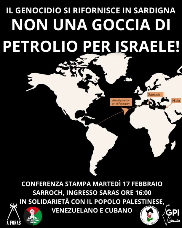 Per denunciare tutto questo abbiamo indetto una conferenza stampa martedì 17 febbraio alle 16:00 davanti all’ingresso dello stabilimento Saras di Sarroch, invitando a presenziare tutti i movimenti, i lavoratori e le persone solidali che vogliono opporsi alla complicità della Saras con l’economia del genocidio e con l’oppressione dei popoli”, affermano i promotori dell’iniziativa.