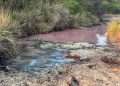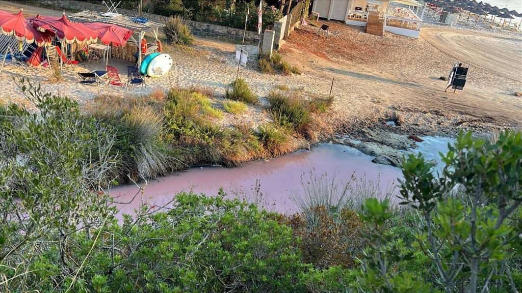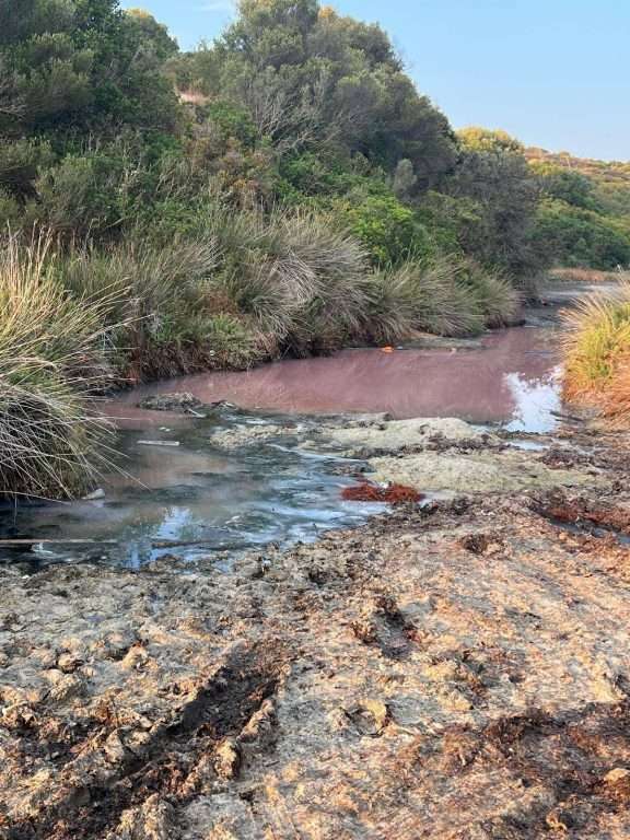 “Queste foto mostrano la situazione preoccupante accanto alla spiaggia di Sos Aranzos nel Comune di Golfo Aranci: un piccolo stagno che, in questo periodo estivo, dovrebbe essere completamente asciutto (come avviene in altri stagni più grandi e vicini), invece è pieno d’acqua torbida di colore rosa/violaceo, con un 𝐟𝐨𝐫𝐭𝐞 𝐜𝐚𝐭𝐭𝐢𝐯𝐨 𝐨𝐝𝐨𝐫𝐞